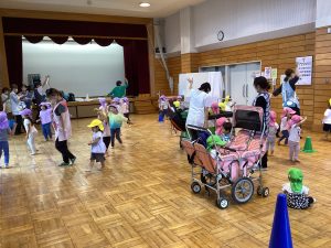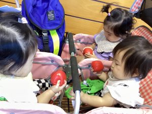 2025.09.24 つくしっ子日記 ひよこ組 今日はさかえ会館で全体練習がありました。 ひよこ組は初めてのさかえ会館!体操など雰囲気を楽しみながら参加できました♪ 玉入れには参加できなかったですが1つずつ渡してみると『何だこれは?』と興味津々で触っていましたよ。