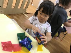 キラキラのカラーセロハンを握ってカップに詰めて作りました♪