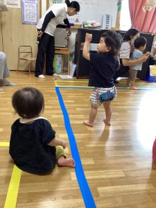 今日の運動会の練習は、こあら組さんのお部屋で行われました。