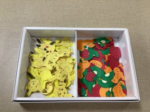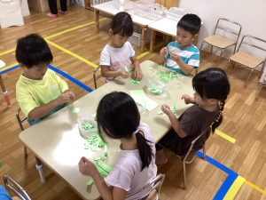 キャベツに見立てて画用紙をちぎり、飾りつけのピカチュウに顔を描きました。