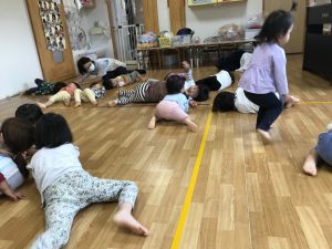 2025.10.15 つくしっ子日記 うさぎ組 今日はリトミックがありました! 今日のリトミックでは色々な動きを行いましたよ♪ 寝っ転がって寝るポーズをした後に… 立ち上がってジャンプ! 緩急のついた動きがとても楽しかったようで大はしゃぎでしたよ。