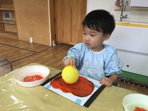 筆やメラミンスポンジ、風船など子どもたちはお気に入りの技法を使ってかぼちゃに色塗りをしていました。♪やさいの歌♪ かぼちゃはチャチャチャと口ずさみながら夢中で取り組む姿がありました。
