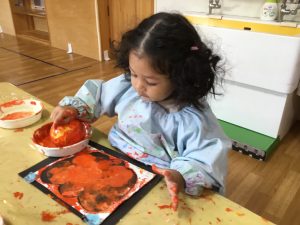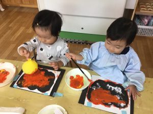 来週のハロウィンに向けて今日はかぼちゃの絵の具製作を行いました。