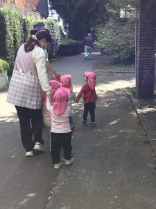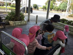 りす組さんの子どもたちは元気に緑道の散策に出掛けました。お友だち同士で手をつなぐことのできる子どもたちも増えてきて、楽しく会話を楽しんだりお歌を歌っていました。