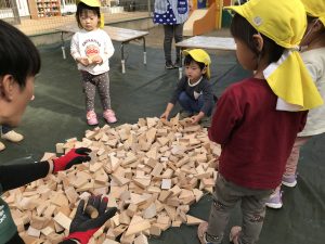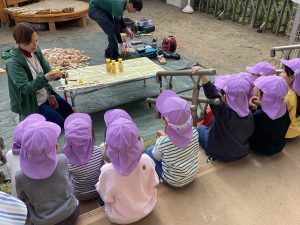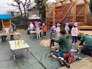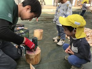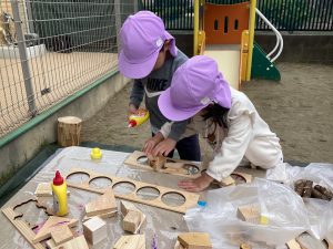 木端を使って、色塗りをしたり、穴を開けてもらったり良い香りの木を使って楽しみました。