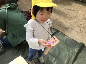 うさぎ組さんは穴を開けたところに、紐を通してもらい、ネックレスにしてもらうのが人気でした!
