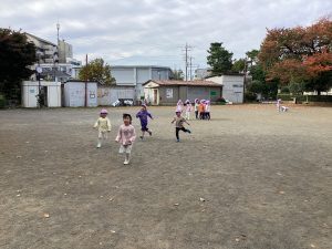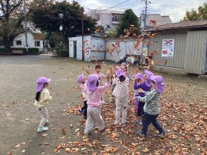 落ち葉がたくさん落ちていたので、「みんなでせーのでなげよう!」と始まり、