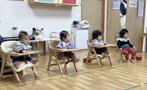 いつも遊びに行くこあら組のお部屋で椅子に座ったひよこ組さん。