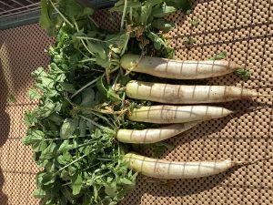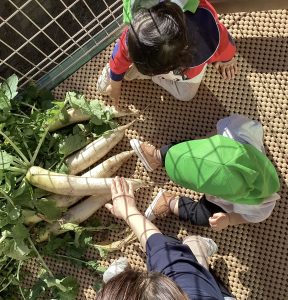 葉がついたままの大根は、大きくて土もついていて、少しドキドキしている様子の子どもたち。