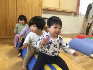 ソフトジムでは保育者も一緒になって、♪いないいないばぁの“わぁお”に合わせてだんごむしになりきって楽しく遊びました。また平均台ではお友だちと一列になってお尻歩きやバスごっこをして遊ぶ子、スイスイと泳ぐ真似をしている子もいました。