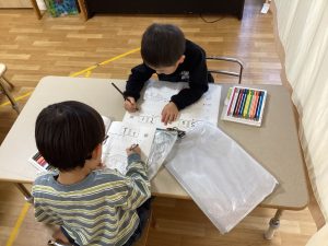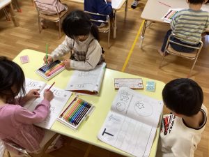 4歳児のにじグループさん、5歳児のそらグループさんはアルファベットを書く練習もしました!今日は「T」を習いましたよ。先生から書き順を教えてもらい、一生懸命練習していました。