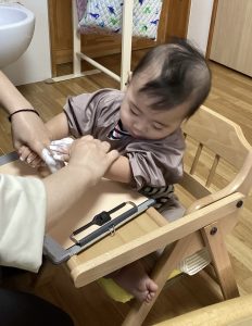 白と緑の絵の具を染み込ませたスポンジに、スタンプのようにして手をポンポンとつけると鮮やかな色がつき、その感触に子どもたちは興味津々でしたよ♪