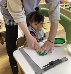 白と緑の絵の具を染み込ませたスポンジに、スタンプのようにして手をポンポンとつけると鮮やかな色がつき、その感触に子どもたちは興味津々でしたよ♪