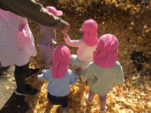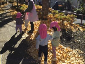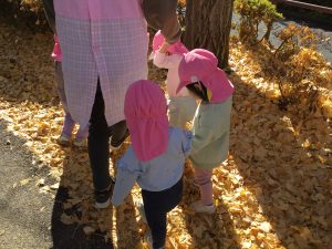緑道では銀杏並木の銀杏が地面に黄色く埋め尽くされていて、子どもたちは足踏みをしながら,「黄色!」と言ったり、「黄色い絨毯だね、ふかふかだね。」と言ってとても喜んでいました。
