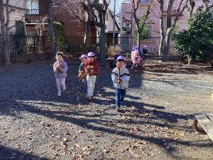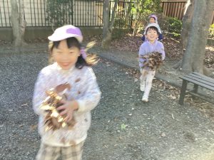 落ち葉がたくさんあるのを見つけると、何かを思いついたお友だちとヒソヒソ、、、