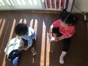 靴下や靴を履く練習を頑張っています。靴下や靴をよく見ながら履くことがポイントです。
