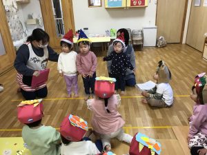 節分の由来や歴史のお話しを聞いた後は、みんなで♪まめまきの歌を歌いました。