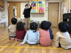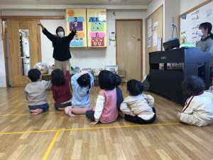 今日のリトミックは、日頃のリトミックとお手ぶしてぶしの童歌も行いました。
