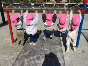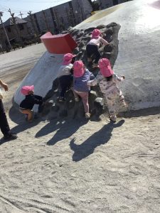 りす組は初めて団地公園までお散歩に行って遊んできました!上手に手足を使って登る姿がありました。最初は怖がっていましたが、お友だちが一緒だと挑戦出来るようです♪楽しくて帰りたくない様子もあったので、また遊びに行きたいと思います。