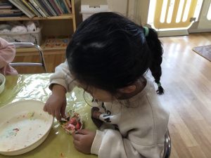 苺に見立てた粘土をケーキの上に飾り付けしたり、お弁当箱を完成させて遊びました。