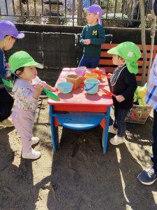 お砂あそびの準備を始めると“これで遊んでいいの?”とニコニコでやってきたひよこ組の子どもたち。机の上に色々広げて“どれで遊ぶ?”と選ばせてあげると目をキラキラさせて好きなシャベルや器を選んで遊んでいましたよ♪